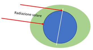 La figura sopra riportata mostra però, che lo strato di atmosfera attraversato dalla radiazione solare dipende anche dall’inclinazione dell’asse terrestre e dall’angolo di incidenza della radiazione solare.
