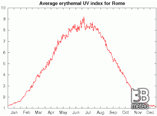 Queste considerazioni ci portano a concludere che sicuramente la radiazione solare, e in particolare quella ultravioletta, sono diverse nelle varie zone della crosta terrestre e cambiano di ora in ora e di giorno in giorno. Ecco ad esempio un grafico pubblicato da “3Bmeteo” che mostra la variazione annuale di radiazione ultravioletta a Roma.