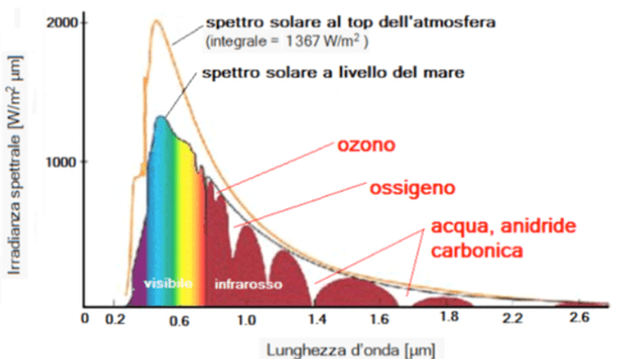Il grafico sopra riportato mostra lo spettro solare e, in particolare, l’area a sinistra del visibile rappresenta i raggi ultravioletti. Il grafico indica che, più è piccolo lo strato di atmosfera sopra la nostra testa, maggiore è la radiazione: in particolare quella visibile, ma anche quelle infrarossa e ultravioletta. Questo perché l’atmosfera ha un effetto assorbente che mitiga la radiazione che incide sulla crosta terrestre.